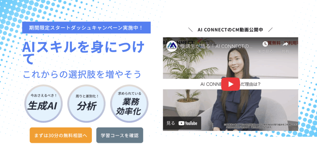 リスキリング補助金は企業等と雇用契約がある方のみが対象で、フリーランスや個人事業主、無職の方は利用できません。その場合、AI CONNECT独自のキャンペーン(30%還元)のみとなるため、他の補助金対象となるコースより割高になる点には注意が必要です。