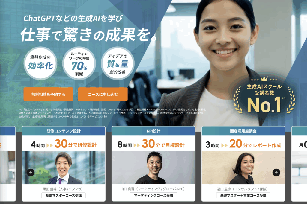 サポートや学べる内容の幅は他スクールより劣るものの、「まずは身近なChatGPTから使いこなせるようになりたい」といった方にはおすすめです。