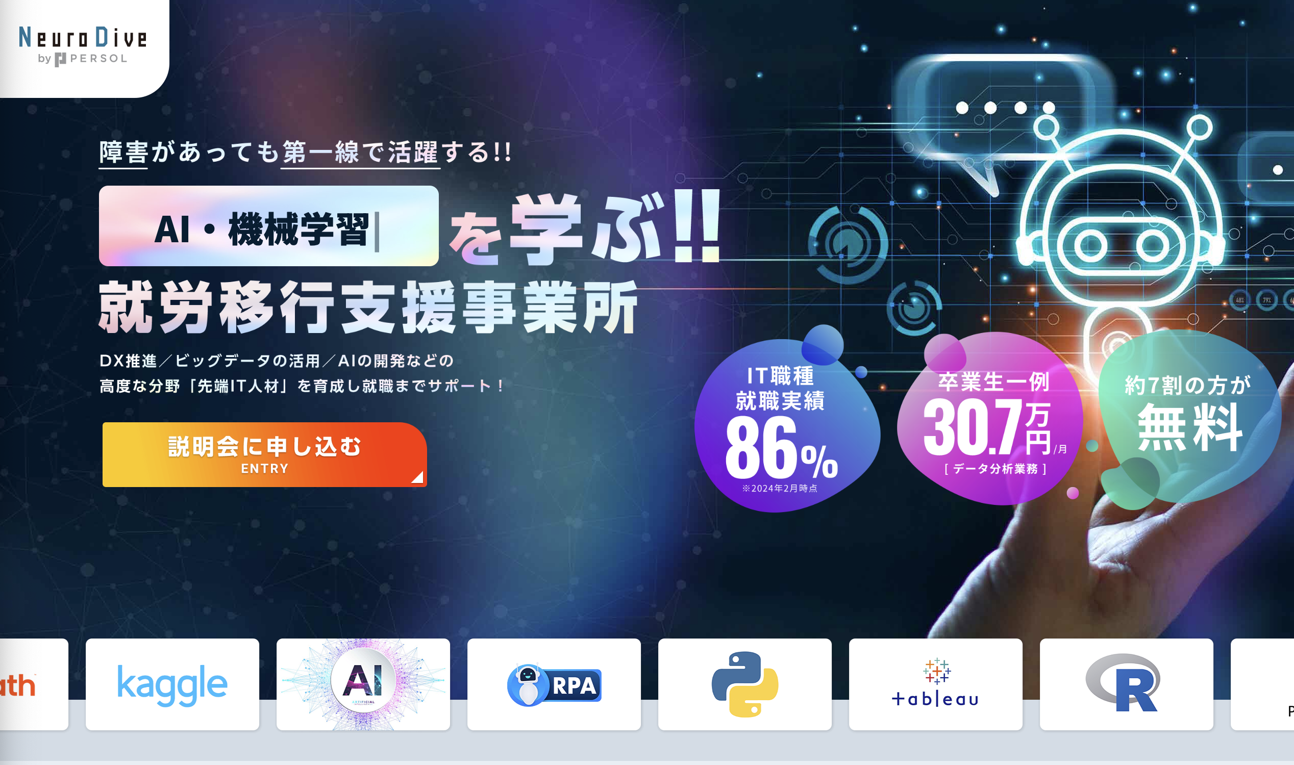 Neuro Diveは、発達障害(ASD・ADHD等)の特性を活かし、AI・機械学習・データサイエンス・RPAなどの先端ITスキルを身につけたうえで一般企業への就職を目指す就労移行支援事業所です。