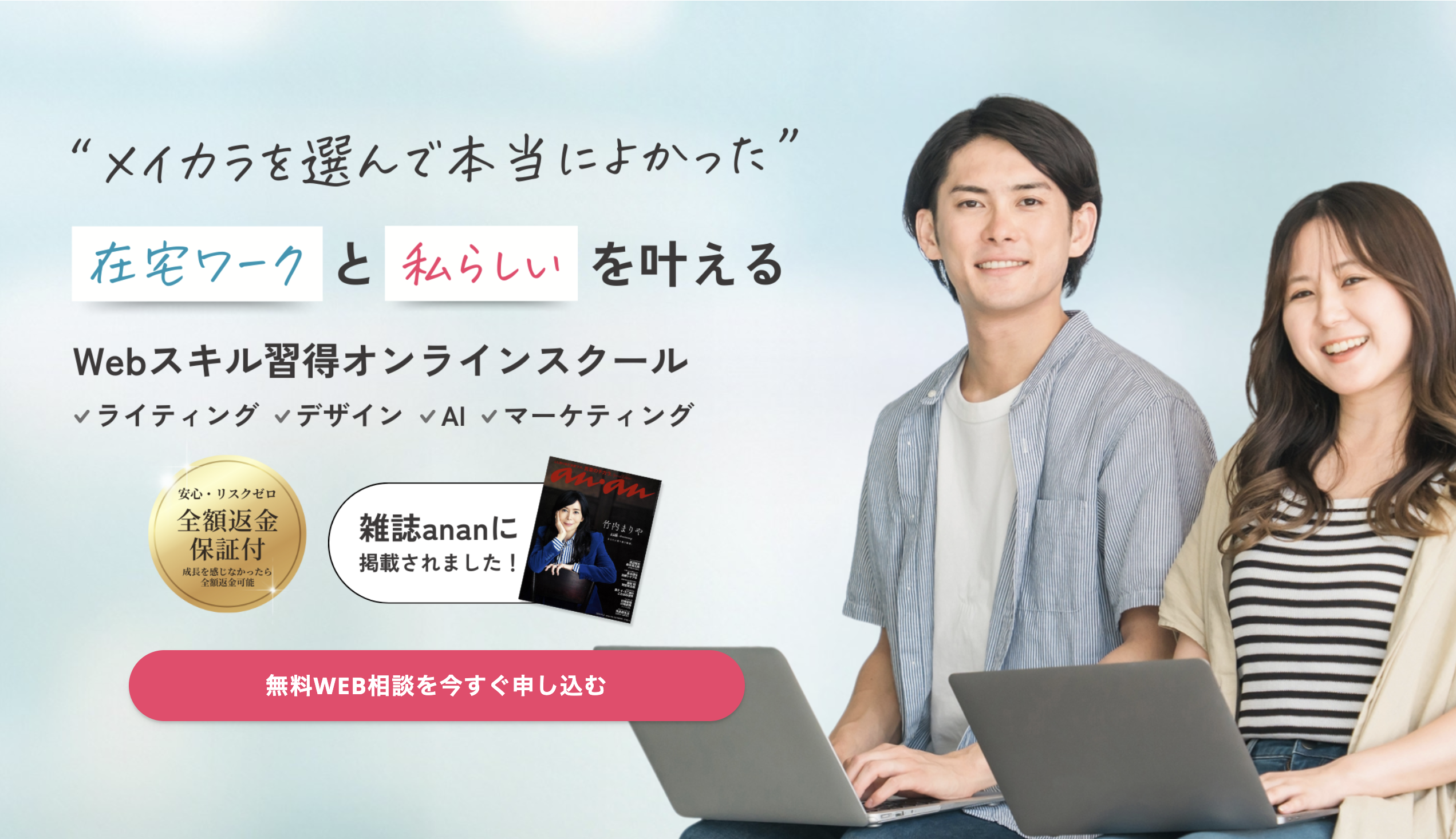 メイカラは、未経験から副業や在宅ワークに役立つライティングやデザインなどのWebスキルと、生成AIの基礎を習得できるオンラインスクールです。