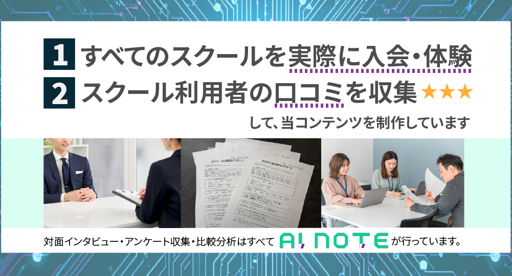本ページに掲載されているAIスクールの紹介内容は、編集部が実際に入会・体験した内容と、スクール利用者の口コミをインタビューした結果を考慮したうえで当サイトの「コンテンツ制作ポリシー」に準拠し作成しています。コンテンツの正確性には情報品質を徹底していますが、万が一誤表記・ご情報を発見されましたら、「お問い合わせフォーム」よりお知らせください。